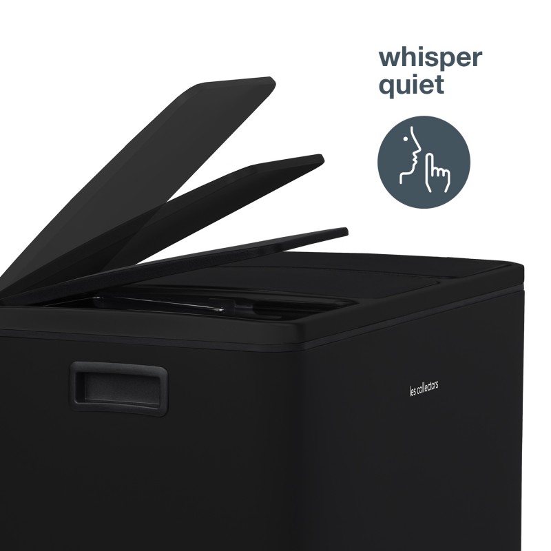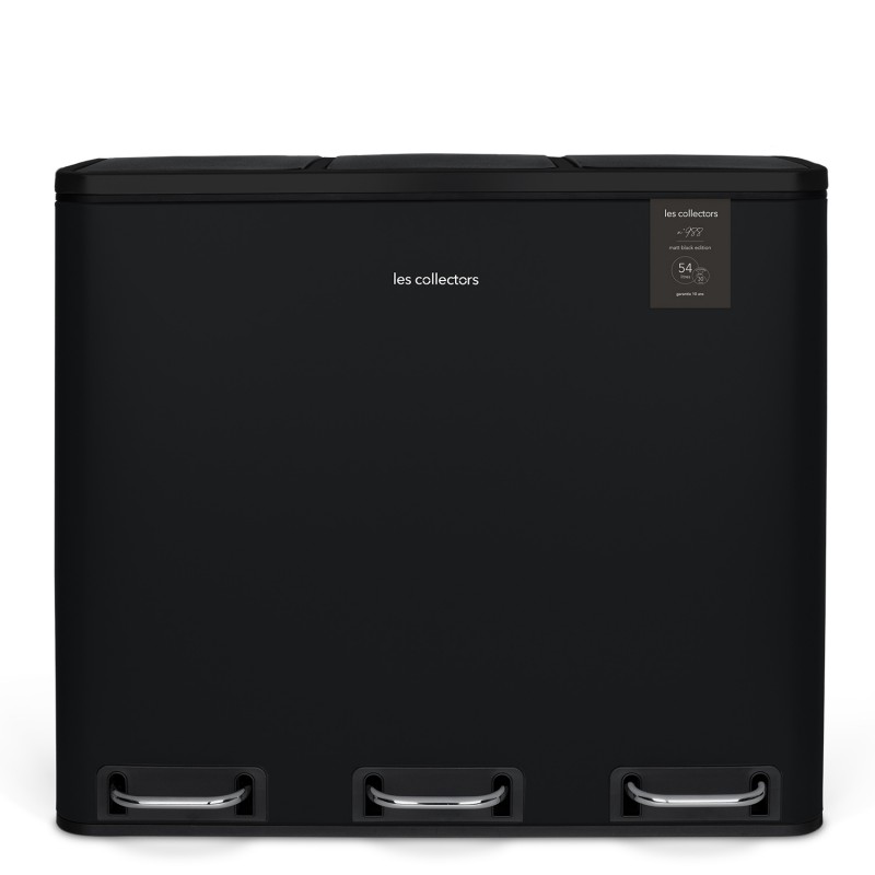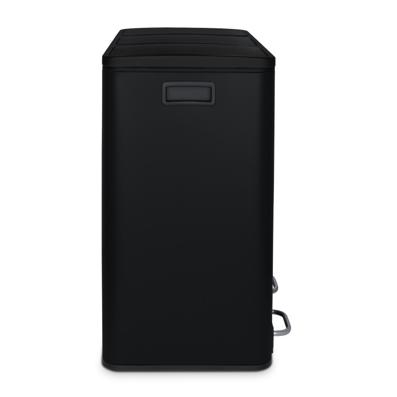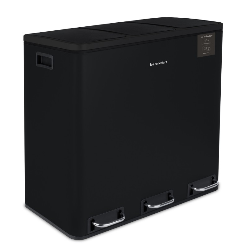 La pattumiera N°988, colore Nero mat, a pedale, ha una Capacità di 54 L. E' resistente con la sua struttura in acciaio inox e possiede 3 scomparti separati per i rifiuti. I cestini interni sono rimovibili per svuotarli e pulirli facilmente. La chiusura del coperchio è silenziosa e discreta.