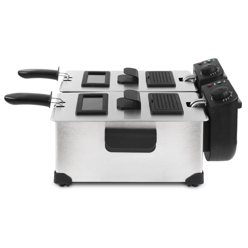 Dotata di una potenza di 3600 watts, questa friggitrice dispone di una doppia vaschetta in acciaio inox, perfetta per realizzare vere e proprie patatine fritte come i professionisti.Con una capacità totale di 6L, ogni vaschetta possiede un termostato indipendente che permette di regolare la temperatura fino a 190°C.