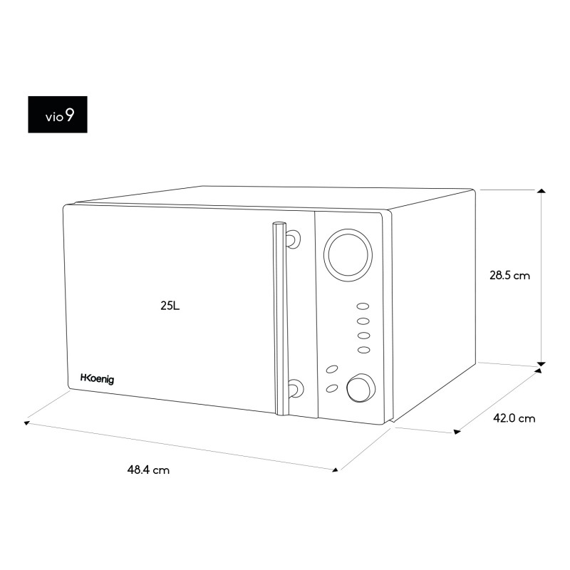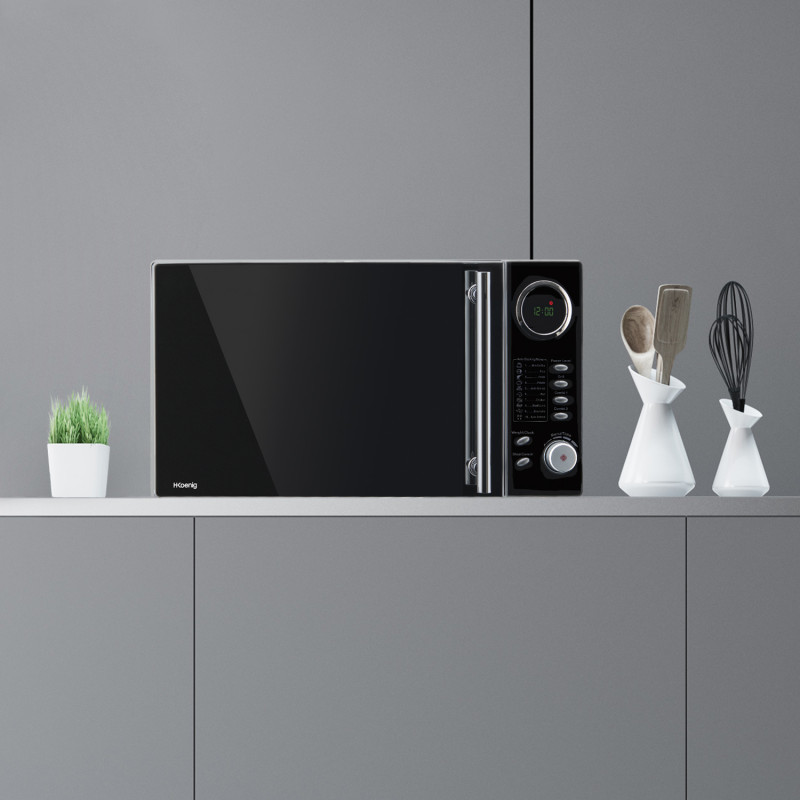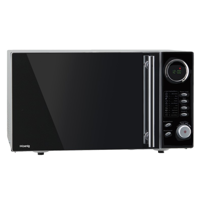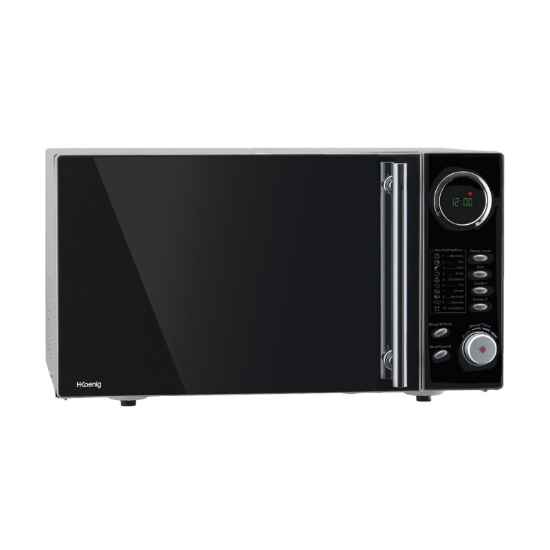 Questo prodotto h.Koenig svolge tre funzioni: forno a microonde, grill e una combinazione dei due. Per aiutarti nella scelta del programma adatto allo scongelamento e cottura del cibo, presenta 10 programmi automatici, oltre alla funzione manuale.Lo schermo LCD ti aiuta nella selezione dei programmi, cosi' come i sei livelli di cottura. Il diametro del piatto é di 27 cm, mentre la capacità di 25 litri. Lo sportello nero ad effetto specchio permetto al prodotto di essere un accessorio di design nella tua cucina.