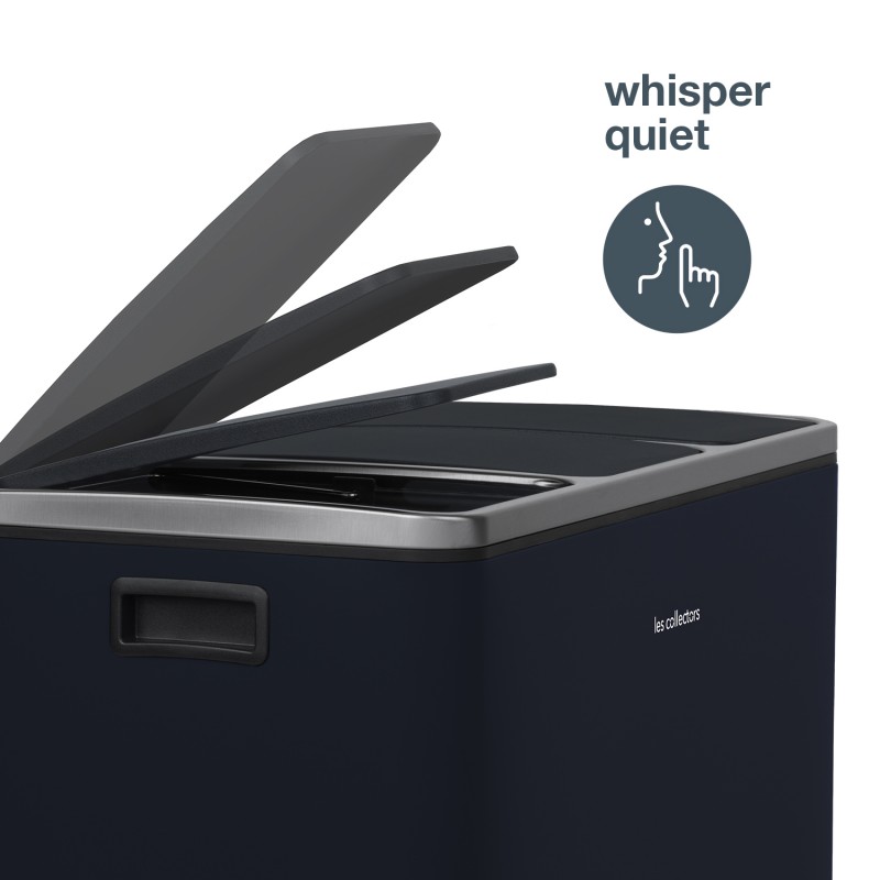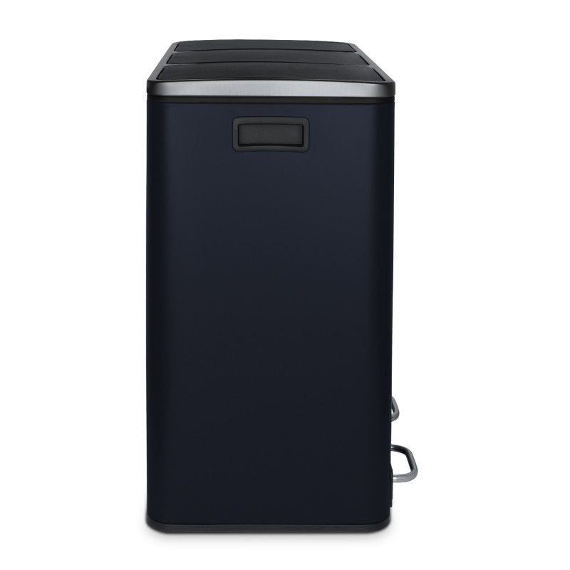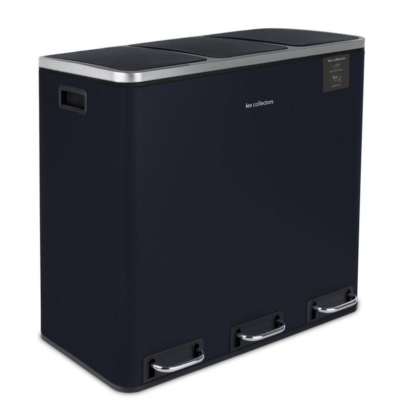 La pattumiera N°986 Blu Notte mat, a pedale, ha una Capacità di 54 L. E' resistente con la sua struttura in acciaio inox e possiede 3 scomparti separati per i rifiuti. I cestini interni sono rimovibili per svuotarli e pulirli facilmente. La chiusura del coperchio è silenziosa e discreta.