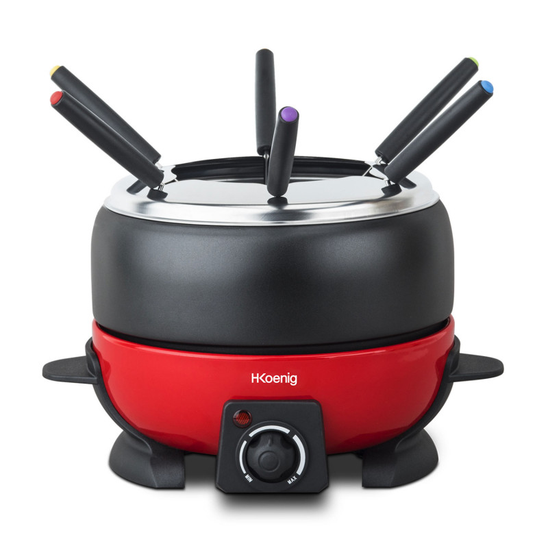 Vuoi condividere dei momenti piacevoli con la vostra famiglia?Fonduta di formaggio, bourguignonne, cioccolato ... siate sempre più creativi e sorprendete i vostri ospiti con il set per Fondue H.Koenig ALP1800! Con la sua grande capacità di 2L, regala alla tua famiglia ed ai tuoi amici una cena divertente per le vostre serate invernali. Il suo termostato regolabile da 25 ° C a 190 ° C assicura una temperatura ideale per tutte le vostre preparazioni. Molto pratico, il set di fondue ALP1800 H.Koenig ha un coperchio praschizzi con il supporto per le forchette. Facile da puilire grazie al rivestimento antiaderente!