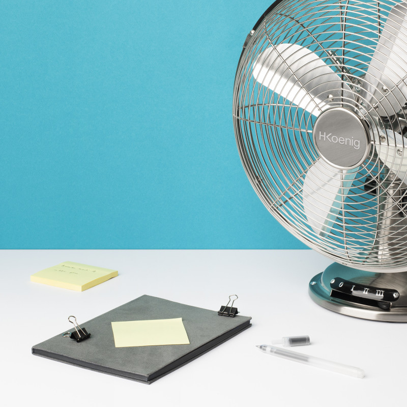 Ventilatore da tavolo in metallo: rinfresca la tua casa con il pratico ventilatore da terra joe48. Con i suoi 30 cm di diametro e la possibilita di regolare l'inclinazione, e il tuo alleato perfetto per quest'estate. La struttura e le pale sono in metallo solido ma leggero. Potrai scegliere tra 3 velocita.
